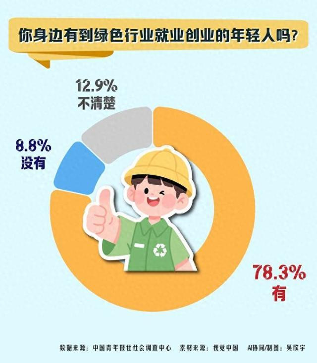 中青报·中青网记者王志伟吴欣宇 新能源汽车、光伏发电、绿色农业……我国经济的“含绿量”越来越高,也为年轻人提供了广阔的发展空间。在2025年世界青年发展论坛开幕前,中国青年报社社会调查中心联合问卷网(wenjuan.com),对1506名青年进行的一项调查显示,78.3%的受访青年表示身边有到绿色产业就业创业的年轻人。